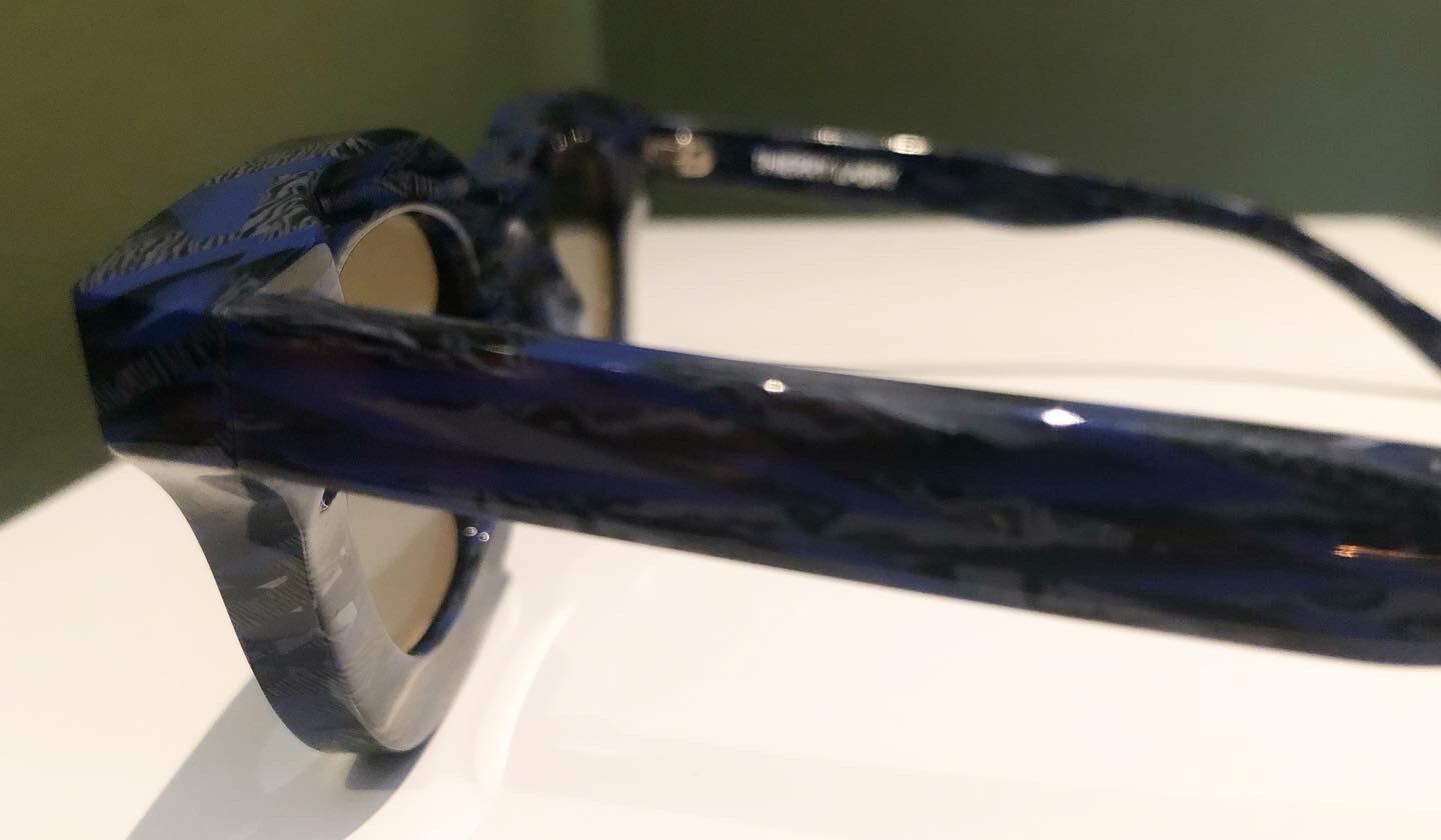 グレー×ネイビー×クリアー×ブラックをマーブル模様のように仕上げたフレームカラーですが
